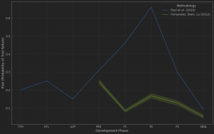 To estimate the transition probability matrix (necessary for the Monte Carlo simulation, Fernandez et al. must have averaged the clinical trial failure rates across a rolling six-month time window, the chosen step size of their simulation algorithm (see the relevant discussion in part 1 of the post). I believe that this averaging results in the loss of information about the time distribution of risk within the R&D phases and yields the flat clinical risk profile seen in Figure 1.