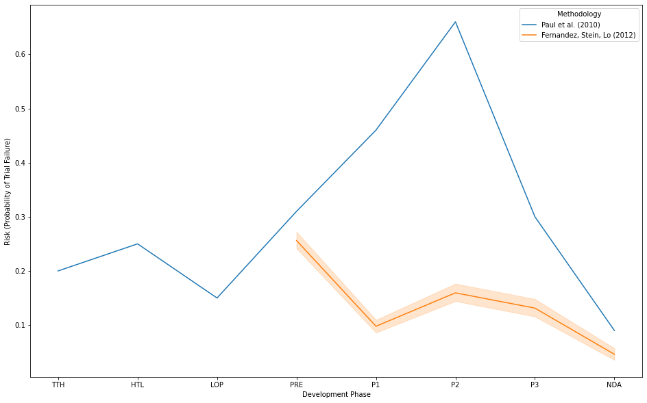 It still does not explain why the Monte Carlo -estimated clinical development risk is lower than that estimated by Survival Analysis (Figure 1) or that reported by Paul et al. (2010), see Figure 3 below: