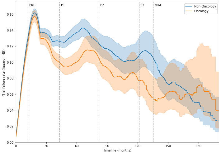 Interestingly the risk profiles between oncology and non-oncology drugs do not differ dramatically. However, oncology studies seem to have a higher overall success rate (lower risk), a slightly longer middle clinical development phase, and a shorter overall development duration, compared to non-oncology studies. These observations are congruent with the idiosyncrasies of oncology drug development.