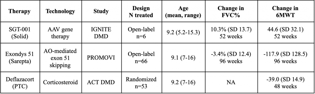 Solid’s gene therapy, SGT-001, also improved 6MWT and FVC% functional outcomes (Table 3).