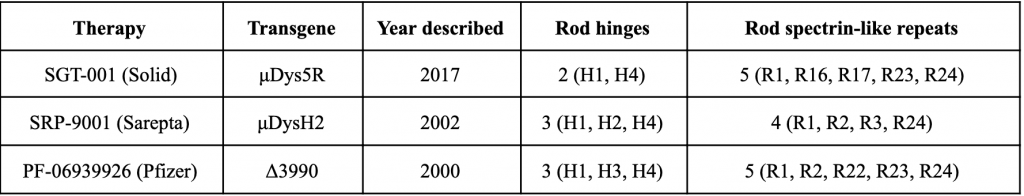 DMD is one of the longest human genes and greatly exceeds the loading capacity of an AAV vector. An inspiration for microdystrophin came from a 61-year-old ambulatory patient with BMD, who had 46% of the dystrophin coding region deleted (England et al., 1990). Subsequent studies showed that in-frame deletions from the middle rod domain of dystrophin often lead to mild disease. The rod domain consists of 24 spectrin-like repeats (R1-R24) and 4 hinges (H1-H4). Different parts of the rod domain are removed in the three AAV-delivered transgenes, so the resulting proteins differ in the remaining hinges and repeats (Table 4).